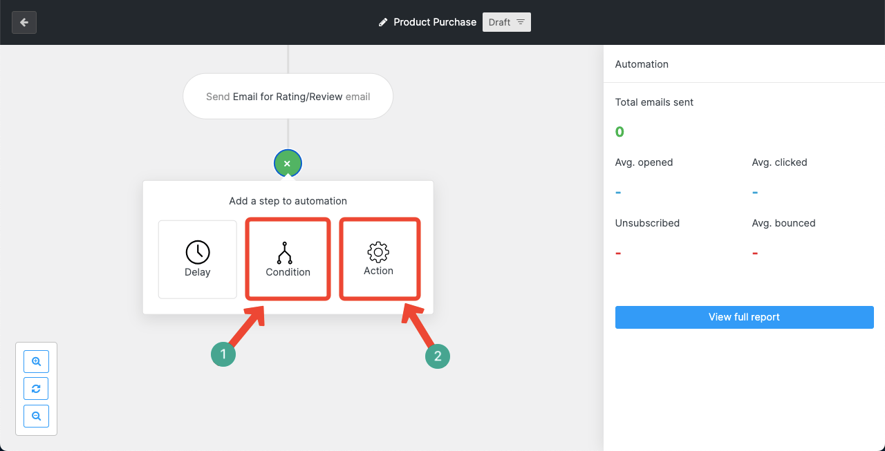 Note: Based on the trigger you select, the default first step will change. As we have selected the Product Purchase Trigger for the automation, you can see the ‘When subscriber purchases a product' as the default first step.