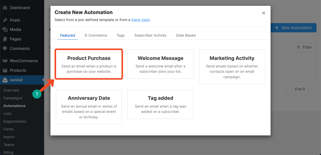 As you are configuring for WooCommerce email automation, select the Product Purchase option.