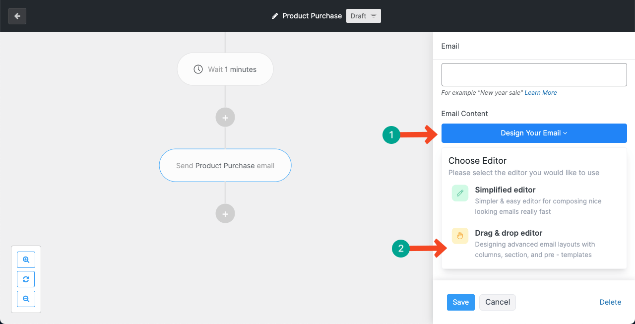 Click the Design Your Email button. You may choose Simplified Editor or Drag & Drop Editor. (Simplified Editor acts like the classic editor, and Drag-&-Drop offers an interface which is similar to page builders).