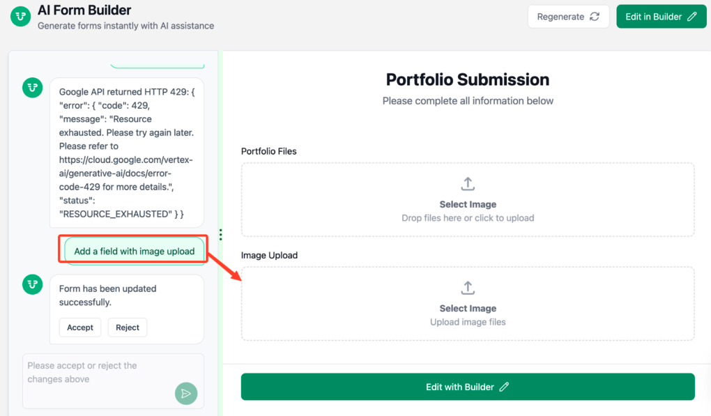 Note: After moving from the AI Form Builder to the Edit with Builder page, you can no longer edit that post form using AI prompts.