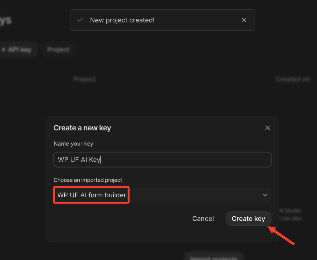 Create a project, or you can also import a project. Then type names for the project and for your key. Select Create key.