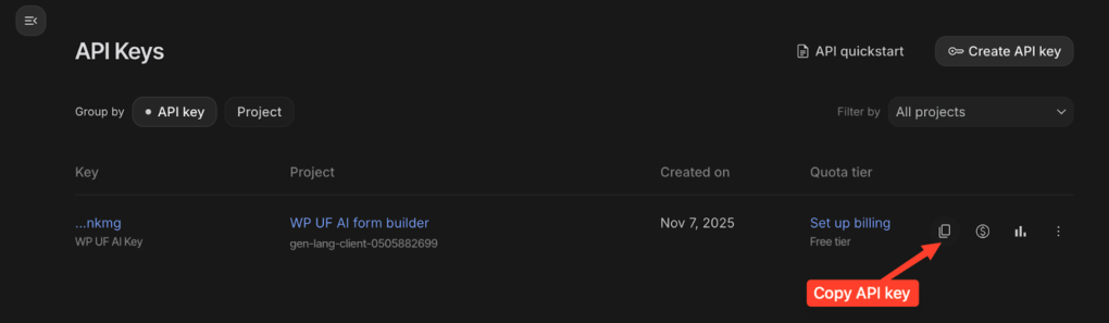 Then choose the AI Model, and click on the ‘API Key’ button. You will be redirected to the AI providers(Google in this case) API Key page.