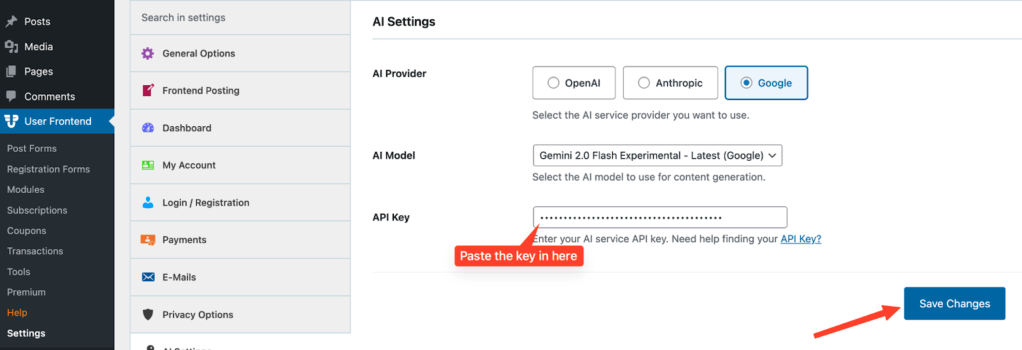First, you need to configure the AI form builder, navigating from User Frontend >> Settings >> AI settings