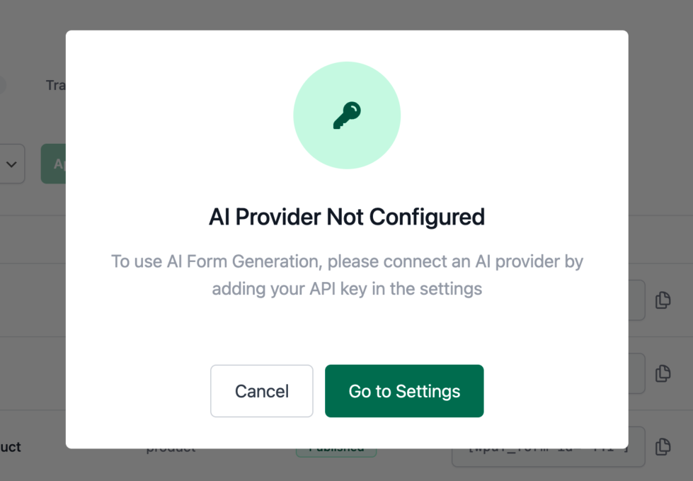 If not configured or follow the above steps to set up the AI form provider, you will get the following notice.